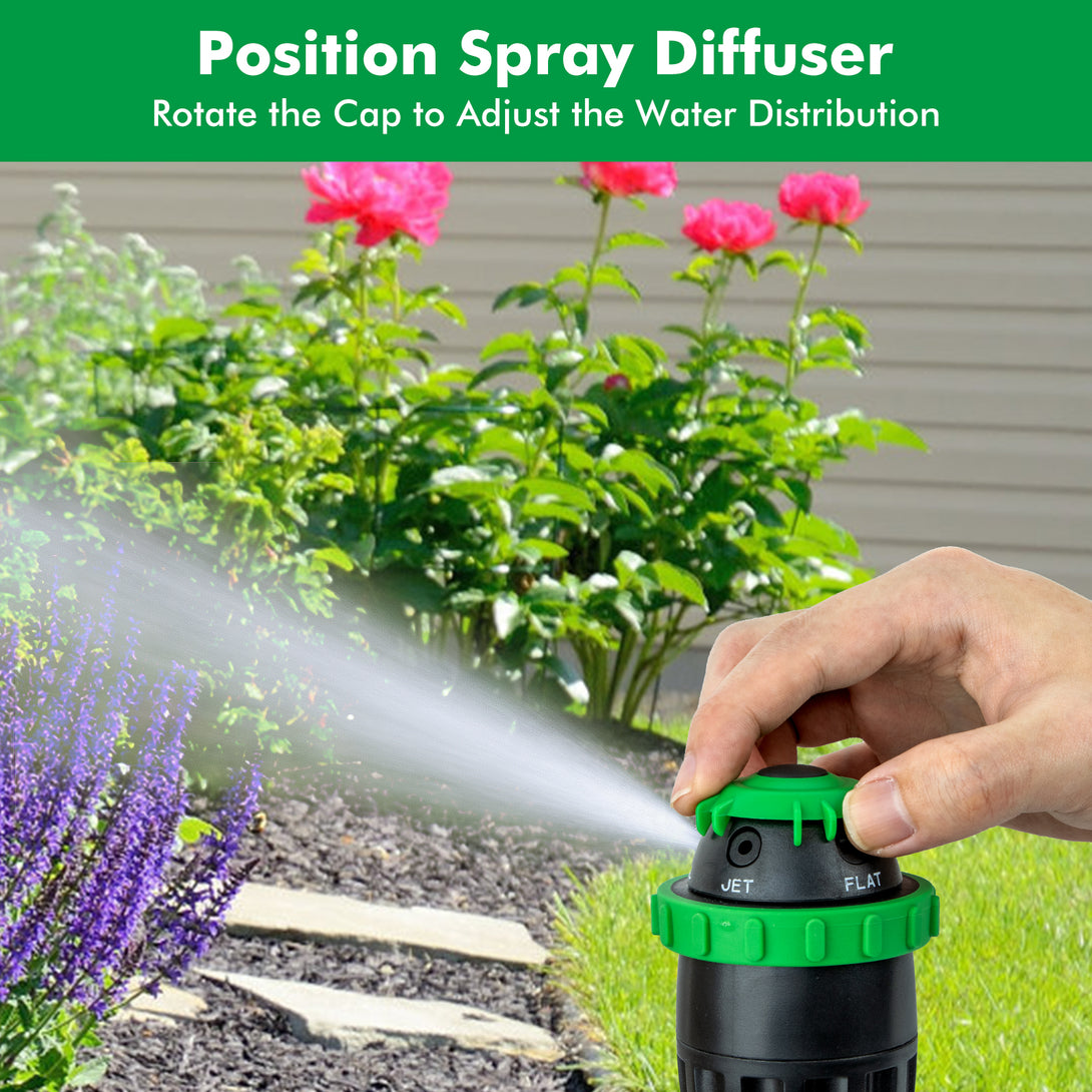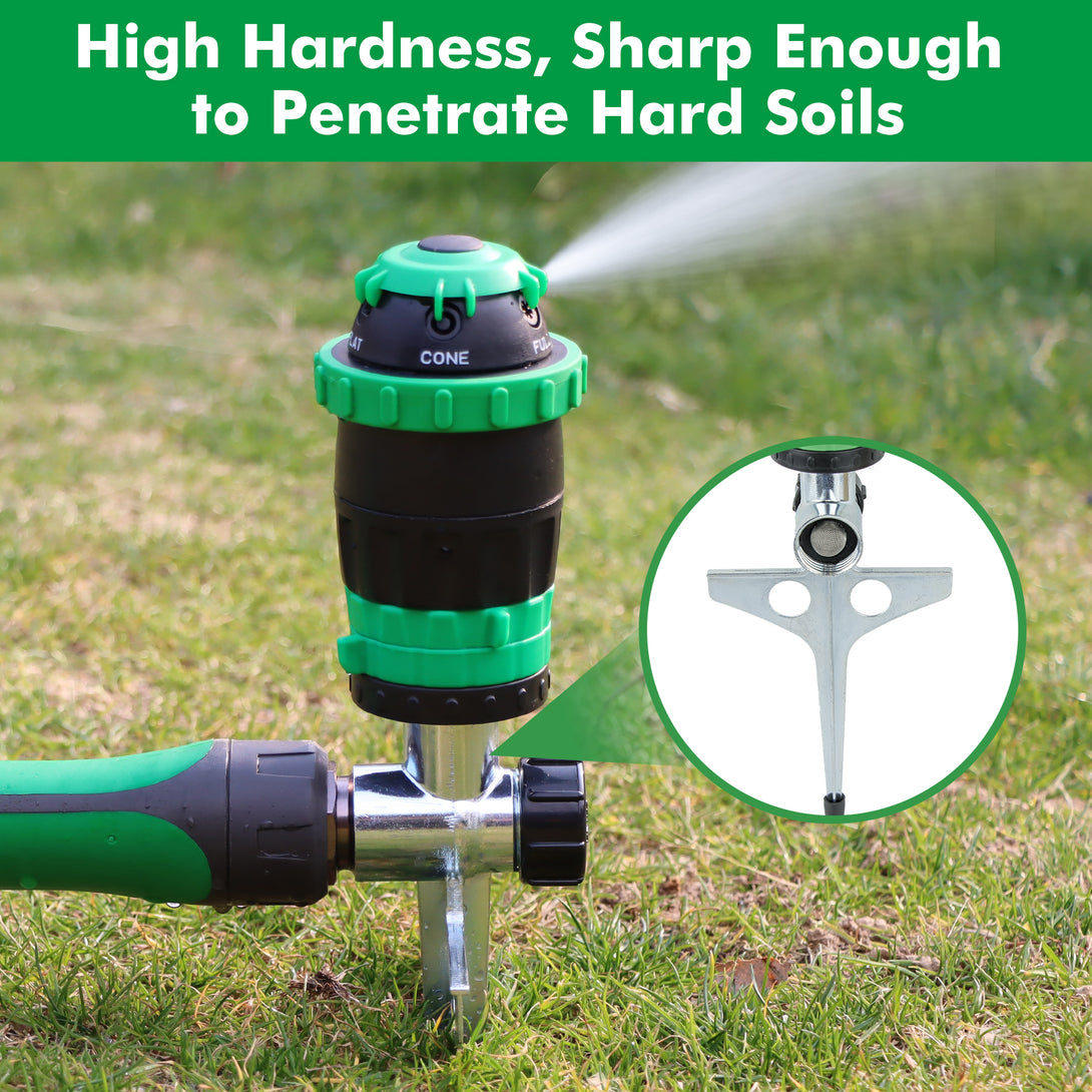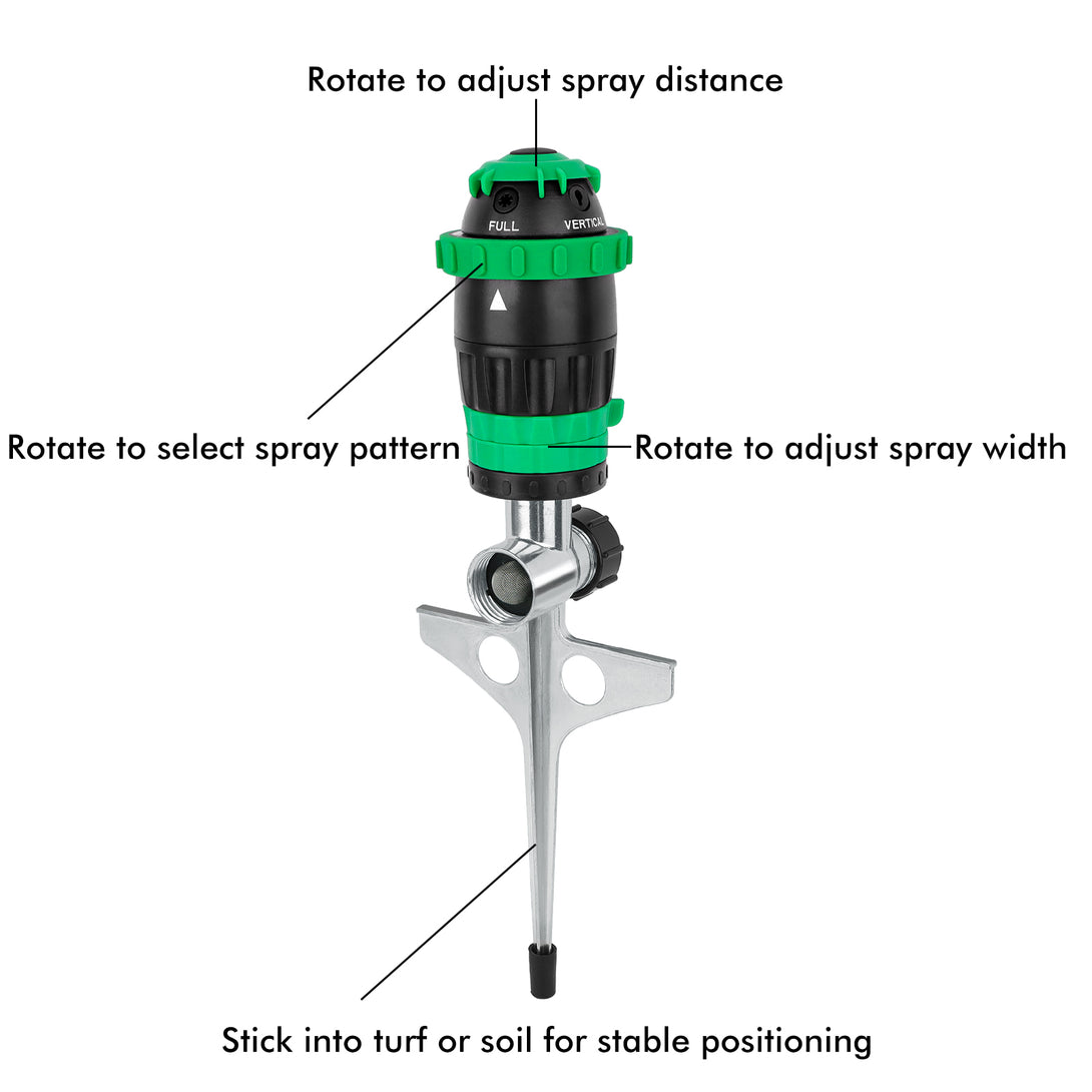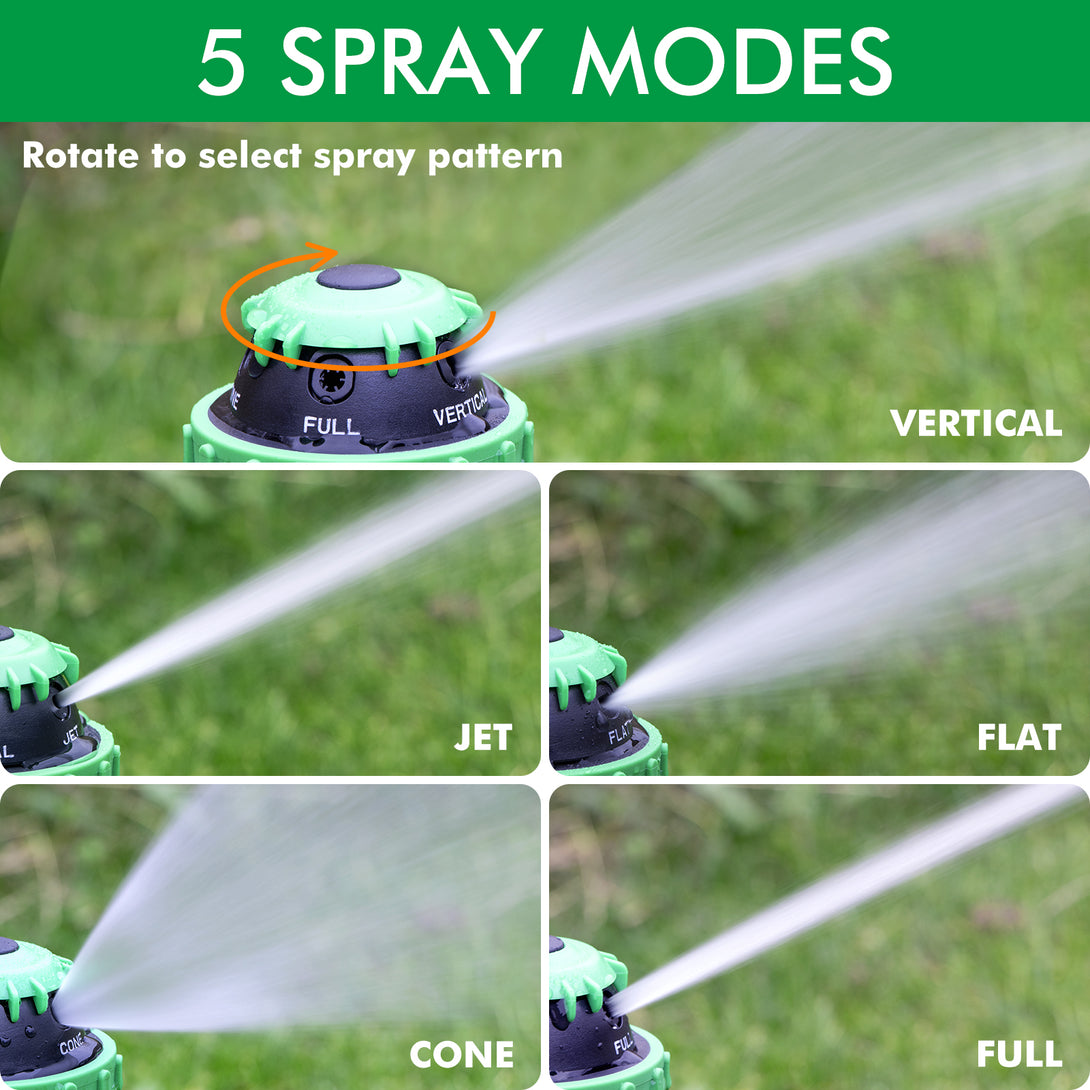 - 5 Versatile Spray Patterns – Customize your watering needs. Choose from 5 spray patterns—Jet, Flat, Cone, Full, and Vertical—to suit different watering tasks. Whether you need a gentle mist for delicate plants or a powerful stream for large lawns, this sprinkler offers unmatched versatility.