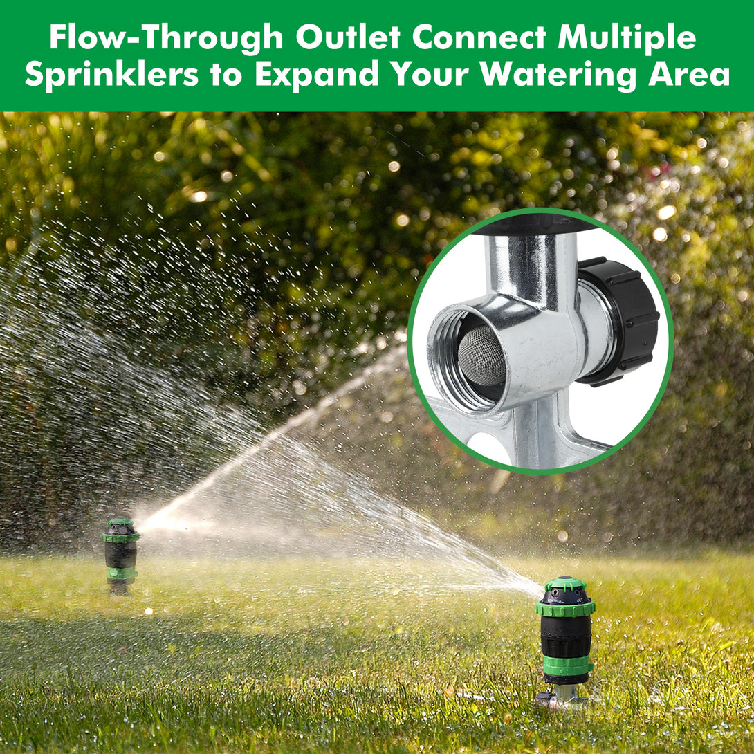 - Connect Multiple Sprinklers – Expand your watering coverage. Maximize your irrigation efficiency with the ability to connect multiple sprinklers in a series. This flow-through design allows you to link several units together, creating a customized watering system that covers larger areas effortlessly. Perfect for expansive lawns, gardens, or yards, this feature ensures even water distribution without the need to constantly move sprinklers around.