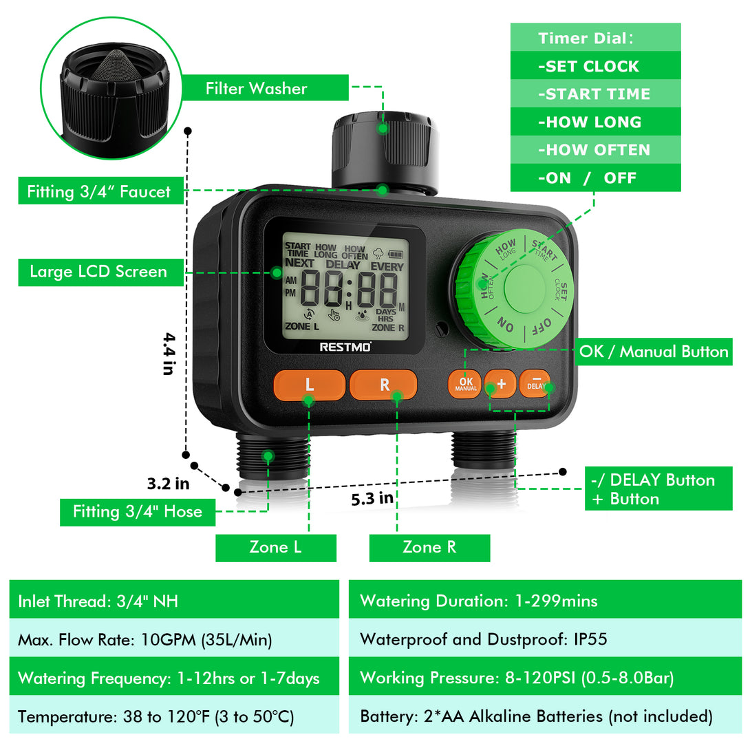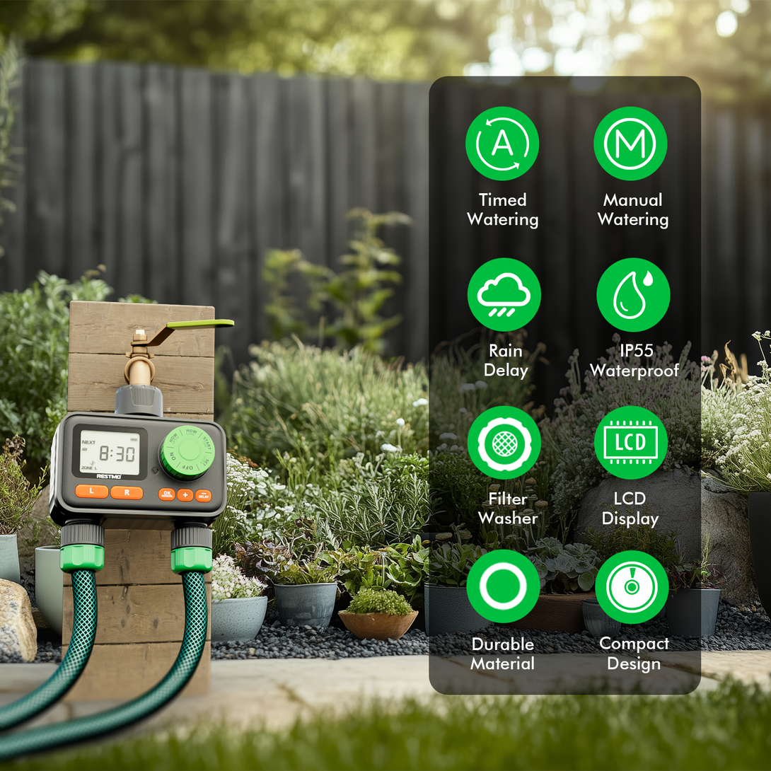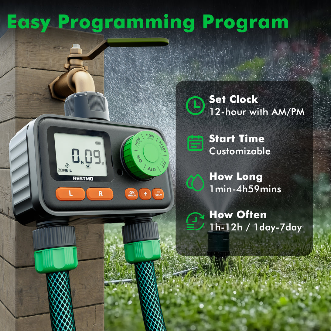 RESTMO 2 Zone Sprinkler Timer, Programmable Water Timer for Garden Hose, Automatic Digital Control | Manual ON/Off | Rain Delay for Outdoor Faucet, Drip Irrigation and Lawn Watering System