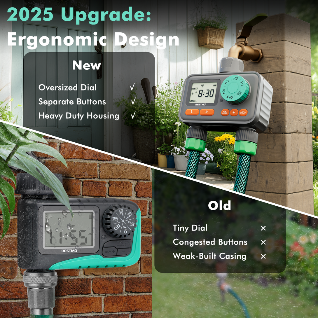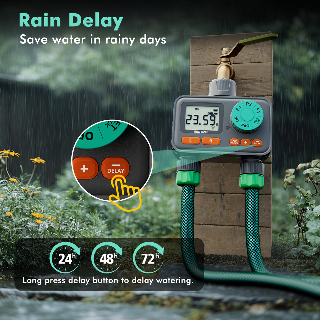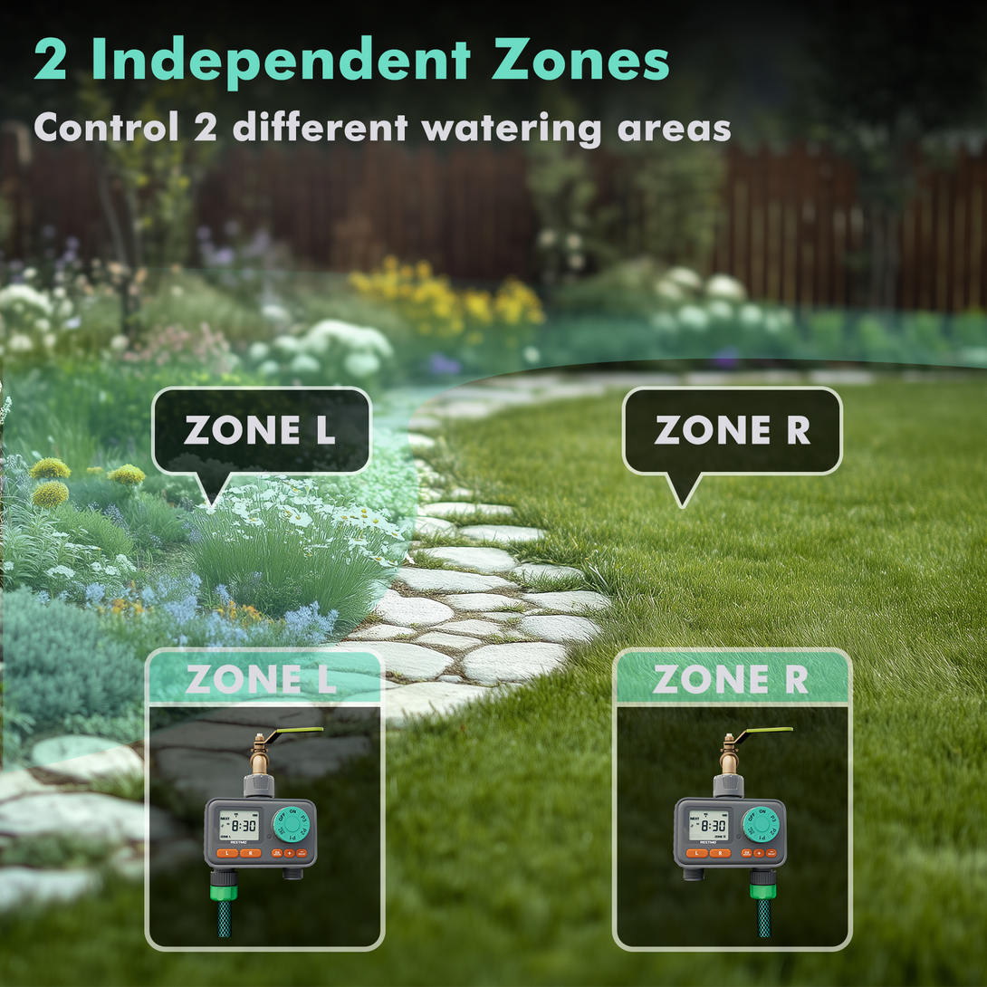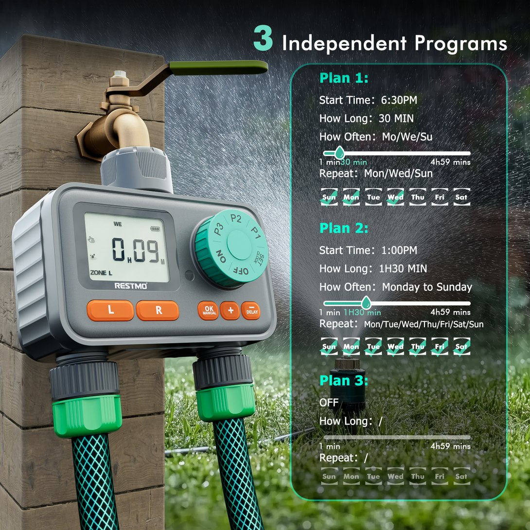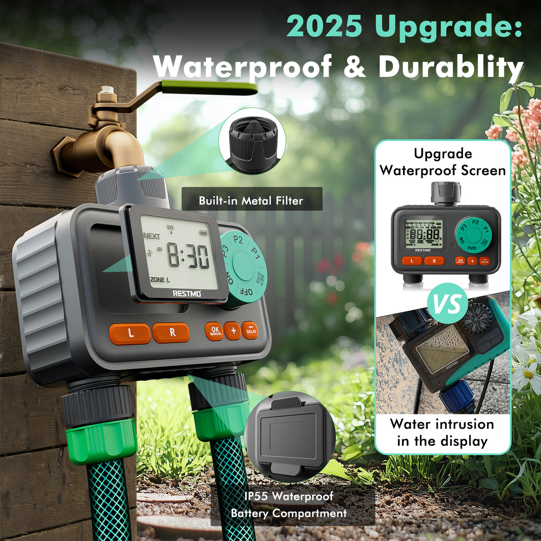 RESTMO 2-Zone Sprinkler Timer with 3 Separate Programs, 7-Day Programmable Water Timer for Garden Hose, Automatic Digital Control/Manual/Rain Delay, Ideal for Drip Irrigation and Lawn Watering System
