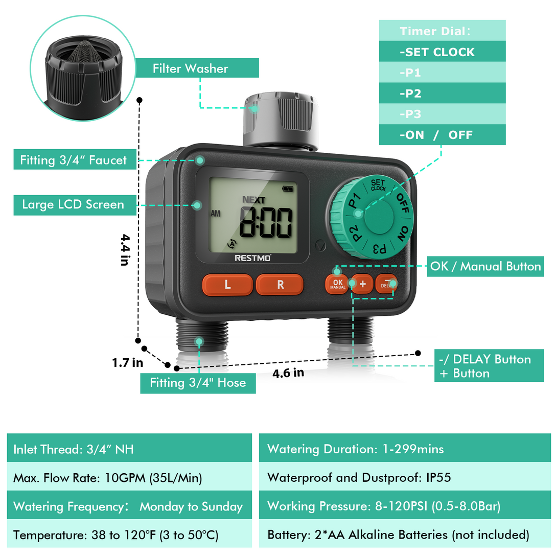 - 【Built for Outdoor Use】Designed with IP55 waterproof protection and leakproof construction. Single outlet with solenoid valve, fitting for 3/4” hose and faucet. Work with 8-120 psi water pressure. This timer is perfect for various outdoor watering applications, including garden hose irrigation, lawn sprinklers, greenhouse misting, pool filling, birdbaths, rain barrels, and even pet water dispensers.