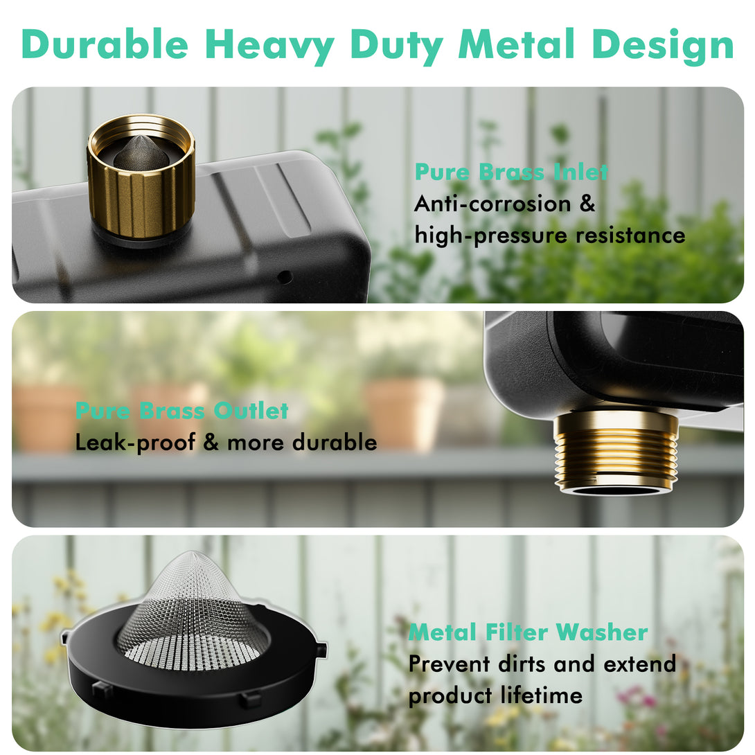 - 【Durable Heavy-Duty Construction】 Built with a pure brass inlet/outlet for superior corrosion resistance and leak-proof performance. The metal filter prevents dirt buildup, extending lifespan and ensuring consistent water flow for worry-free irrigation. Its robust metal design guarantees durability in all weather conditions, making it ideal for long-term outdoor use.
