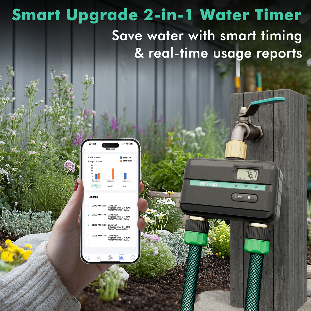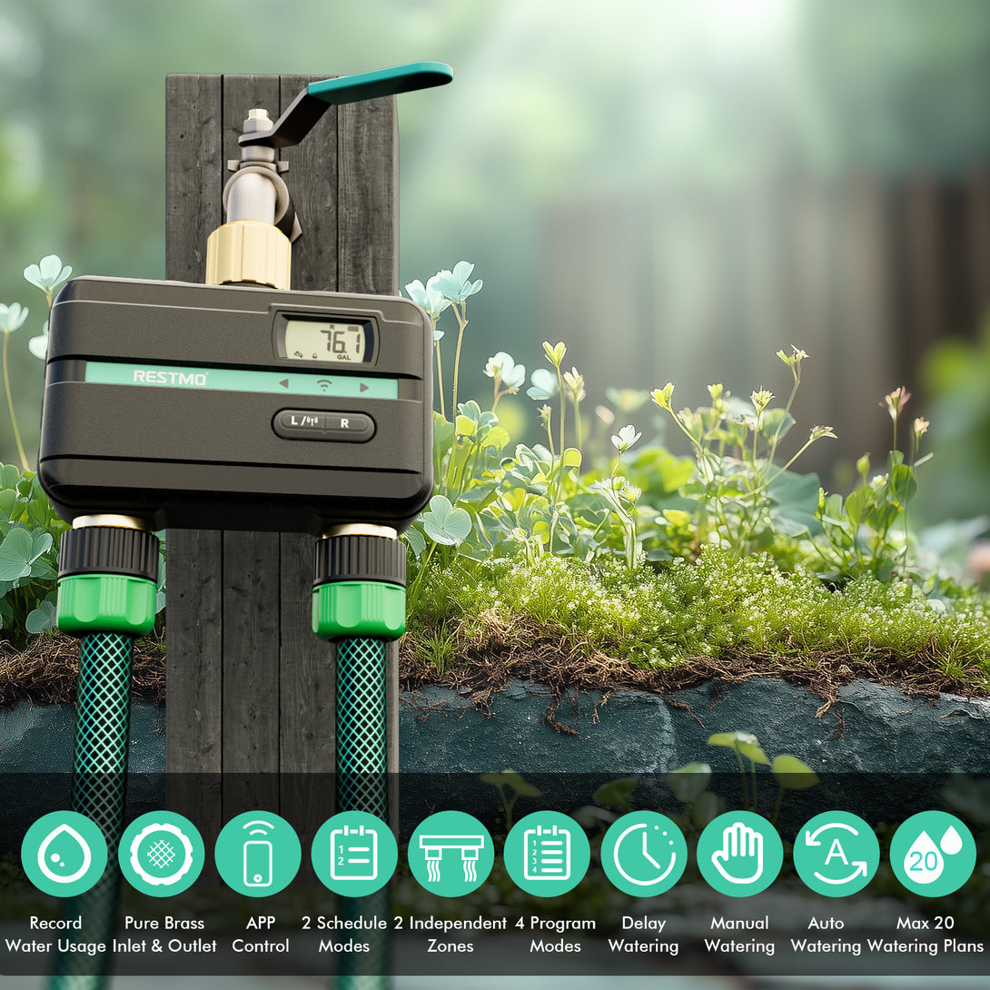 RESTMO Bluetooth Remote Control Smart Water Timer with Flow Meter, 2 Zone Water Timer for Garden Hose, Brass Inlet & Outlet, Automatic Lawn & Yard Irrigation Watering System, APP Remote Control