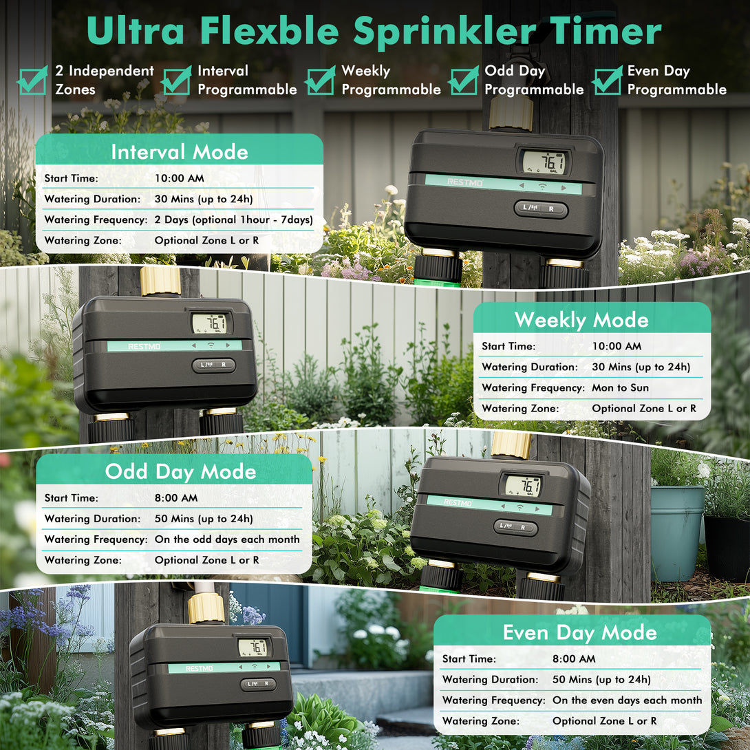 - 【Dual-Zone Independent Control】 Designed with 2 independent outlets, this timer allows you to set separate schedules for two different zones. Whether you're watering the front lawn and backyard garden or two types of plants with different needs, each zone can run its own customized plan—perfect for maximizing efficiency and coverage with one device.