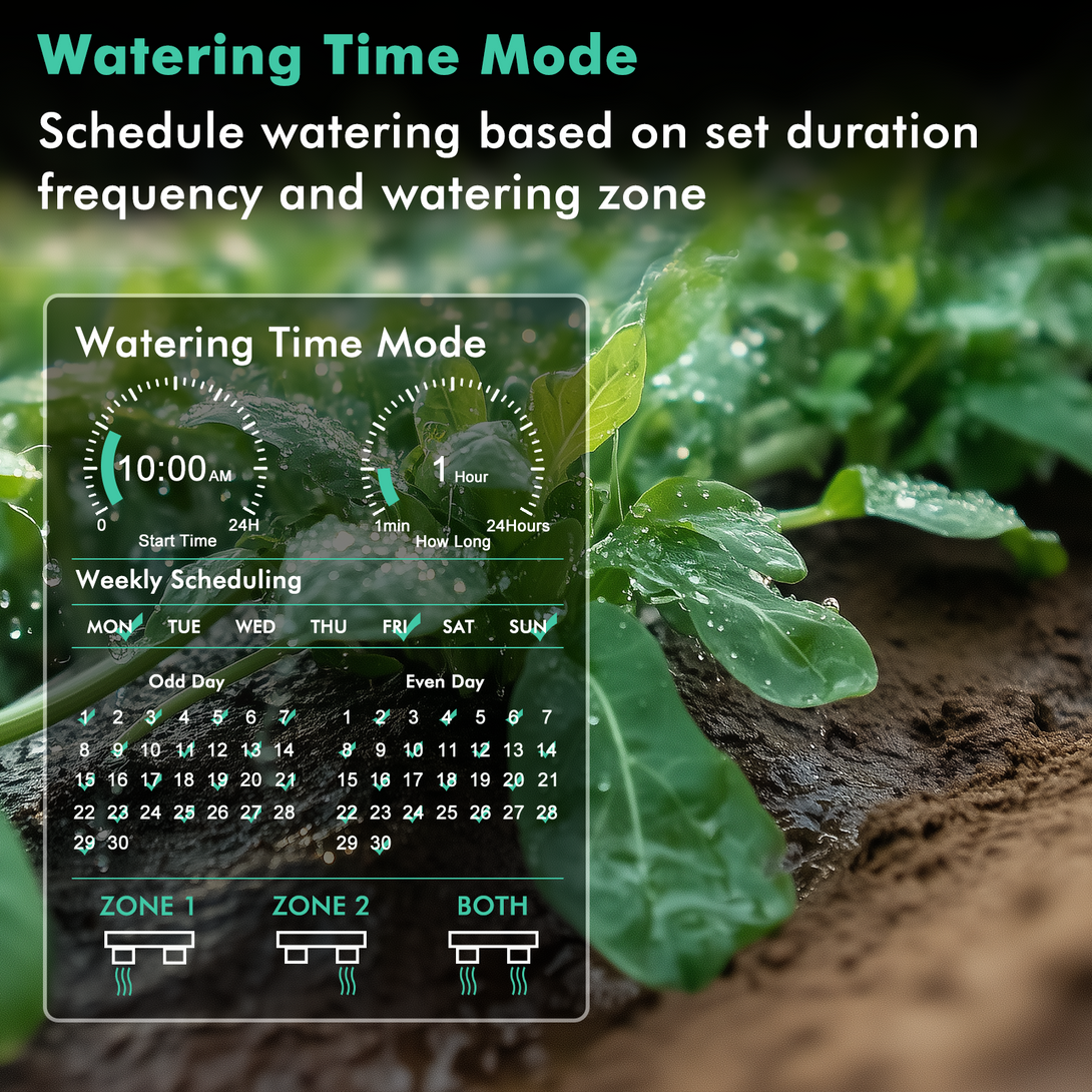 - 【Fully Customizable Plans】 Customize watering plans with 4 flexible modes: Interval (1hr-7day frequency), Weekly, Odd Day, or Even Day. Set up to 8 independent schedules per zone with precise start times, durations (1min-24hrs), and frequencies to meet diverse plant needs. Whether for daily lawn care or monthly flower bed maintenance, the intuitive interface lets you tailor irrigation effortlessly.