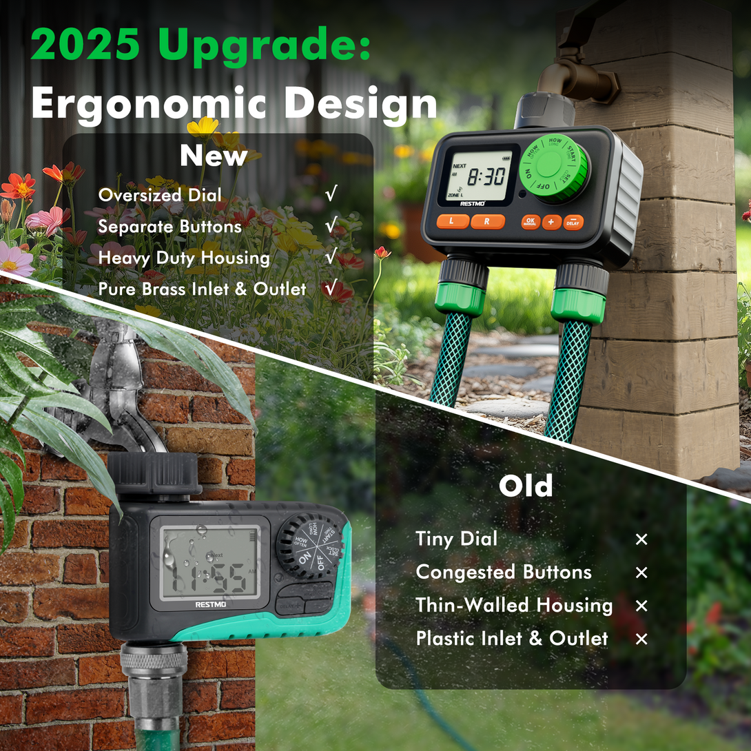 - 【Upgrade Waterproof & Durability】 The pure brass inlet and outlet are heavy duty and enhance durability, easy to tighten without stripping the threads. Engineered for absolute leak-proof confidence, seamless embedded screen eradicates water ingress, while the rugged textured panel withstands harsh wear. oversized dial and button for easy programming. Rotate the dial to set clock, start time, how long and how often. Then your irrigation system will become automatic and operate as per the program.