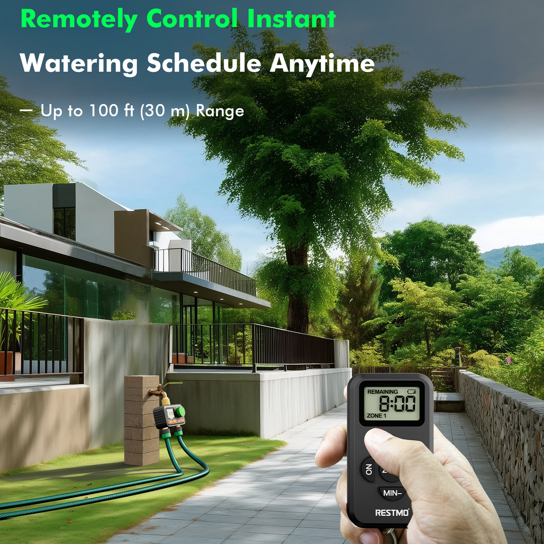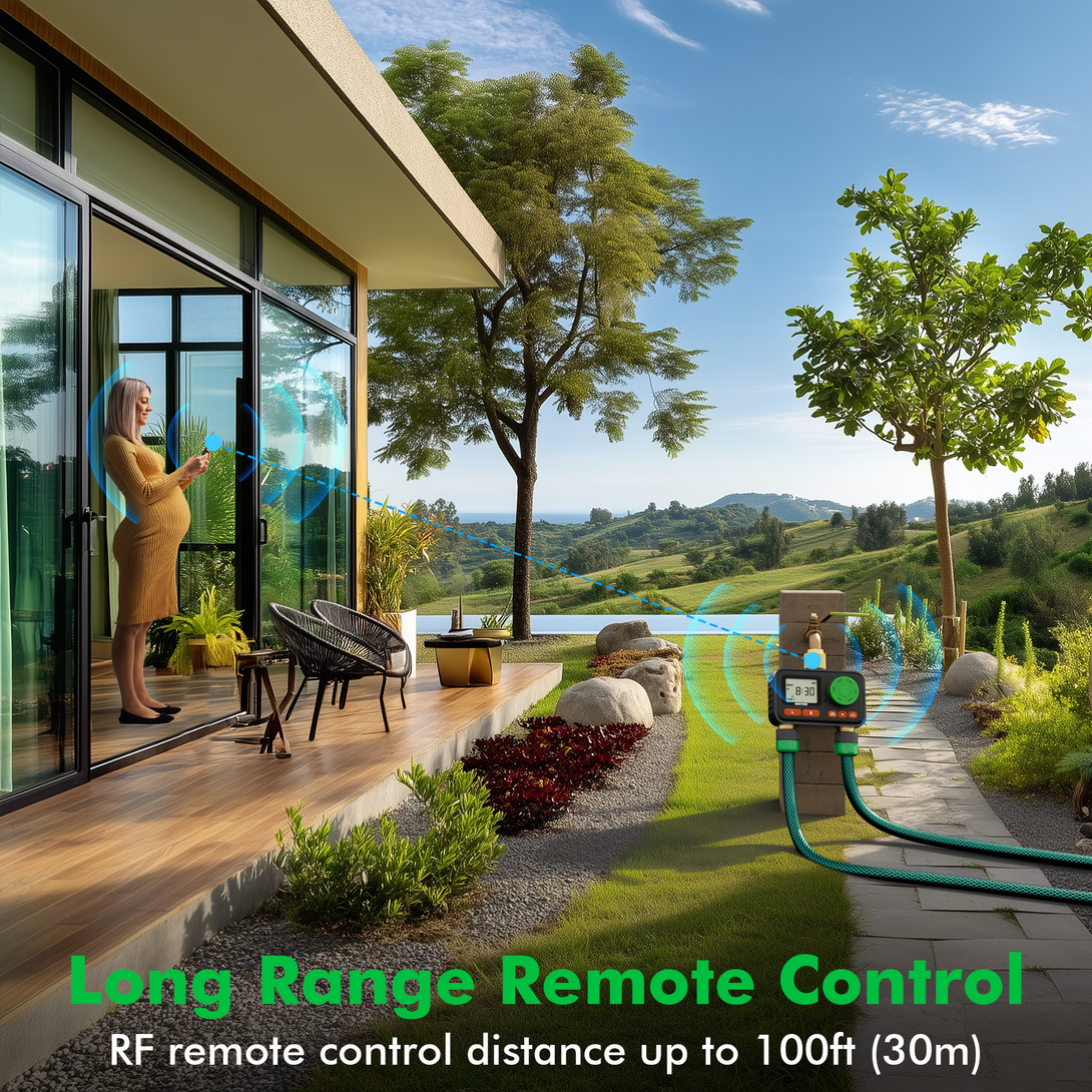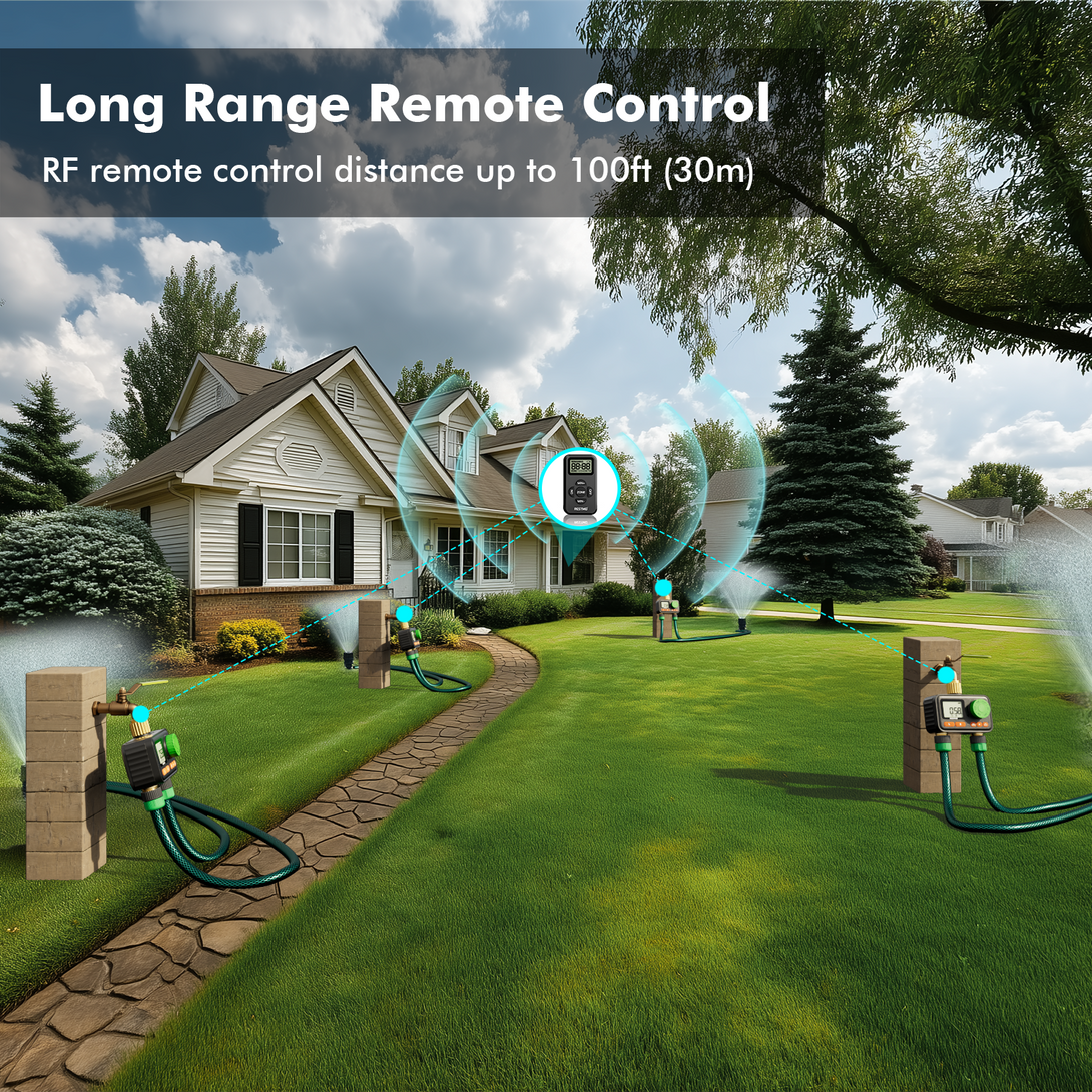 - 【Remote Control Convenience】 Easily manage multiple sprinkler timers with the included RF remote control. With a range of up to 100ft(30m), you can customize watering schedules for different areas at the push of a button—no need to walk back and forth, enjoy full flexibility and convenience!
