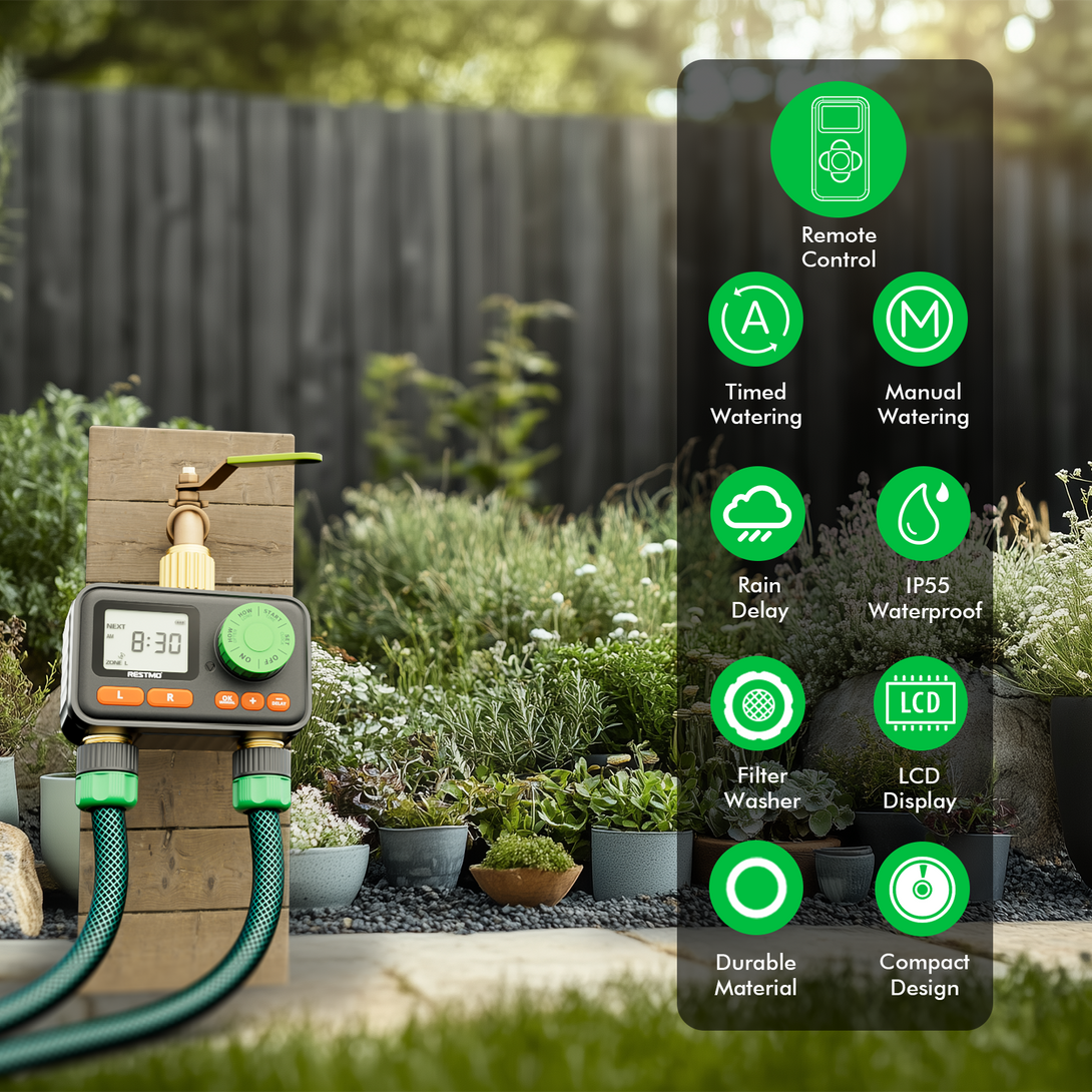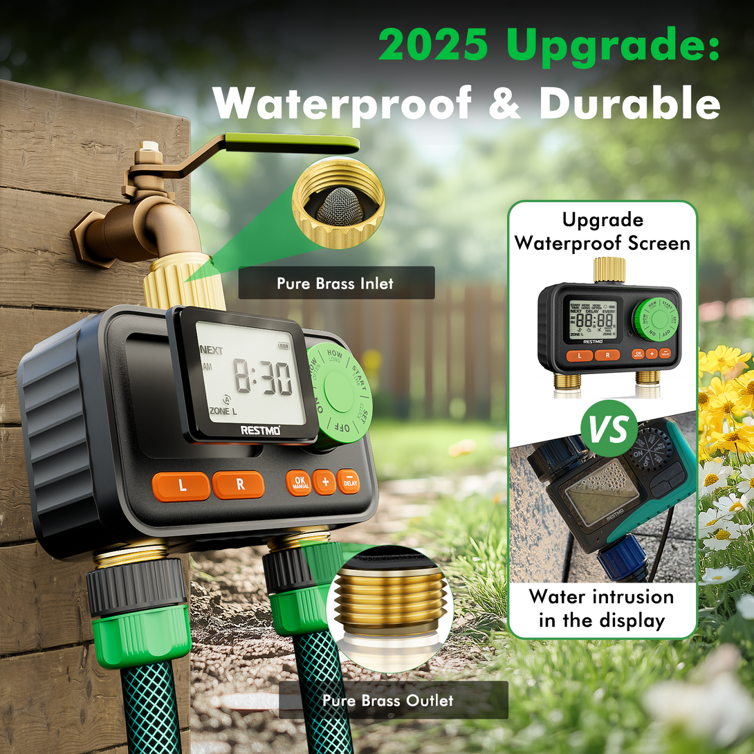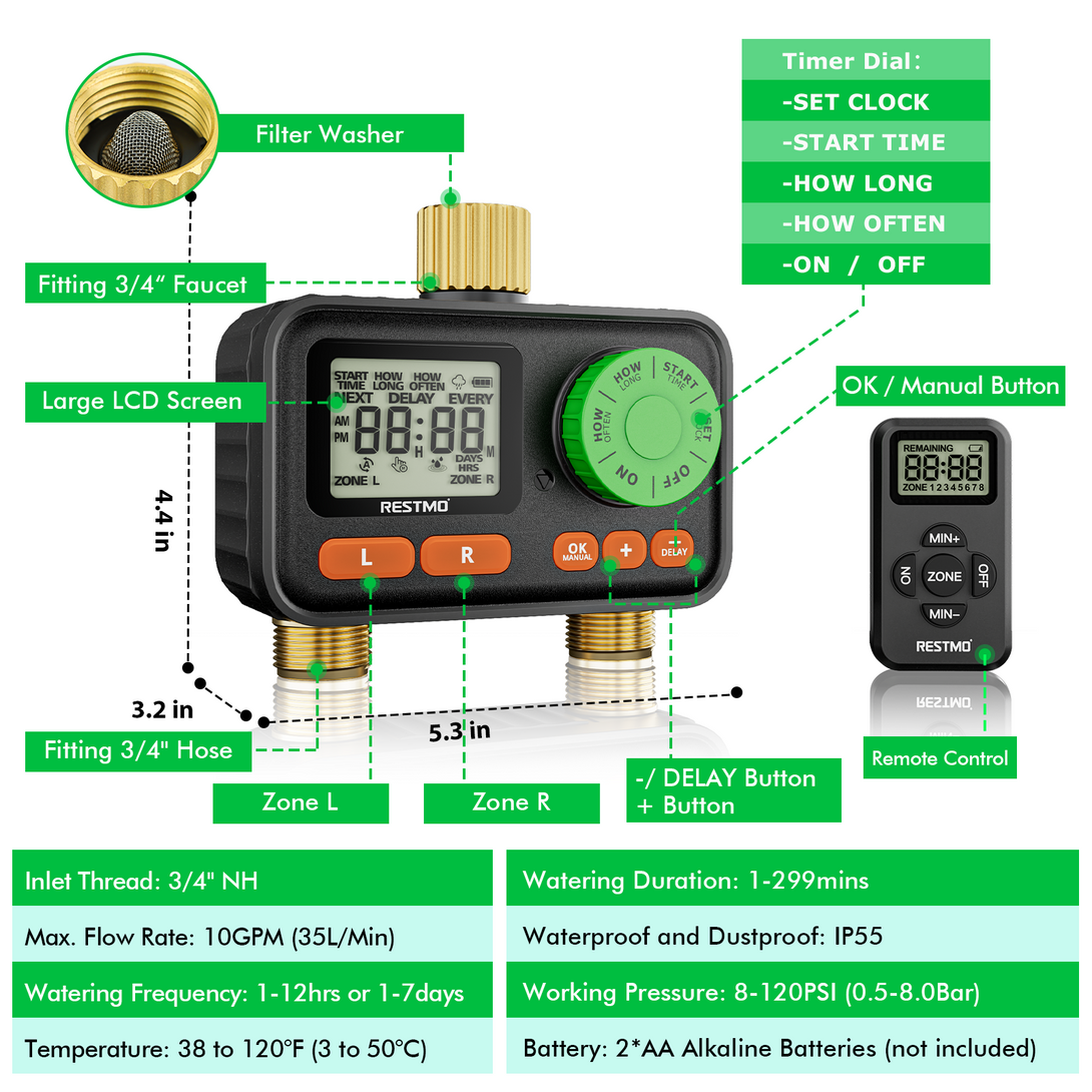 RESTMO RF Remote Controlled Sprinkler Timer with Brass Inlet & Outlet, Water Timer for Garden Hose, Automatic/Manual/Rain Delay for Outdoor Faucet, Drip Irrigation and Lawn Watering, 2 Outlet