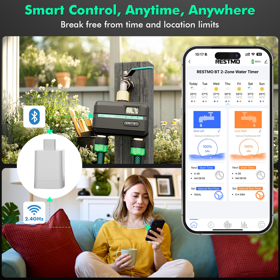 - 【Wi-Fi & Bluetooth Dual-Mode Control】 When connected to a 2.4GHz Wi-Fi network, the sprinkler timer and Wi-Fi hub can be remotely managed anytime, anywhere via the Smart App. Whether you're at home or not, effortlessly manage watering schedules, rain delays, and manual starts. No problem—simply switch to Bluetooth for local control within a 50-meter range. (Note: 5GHz Wi-Fi is not supported.)
