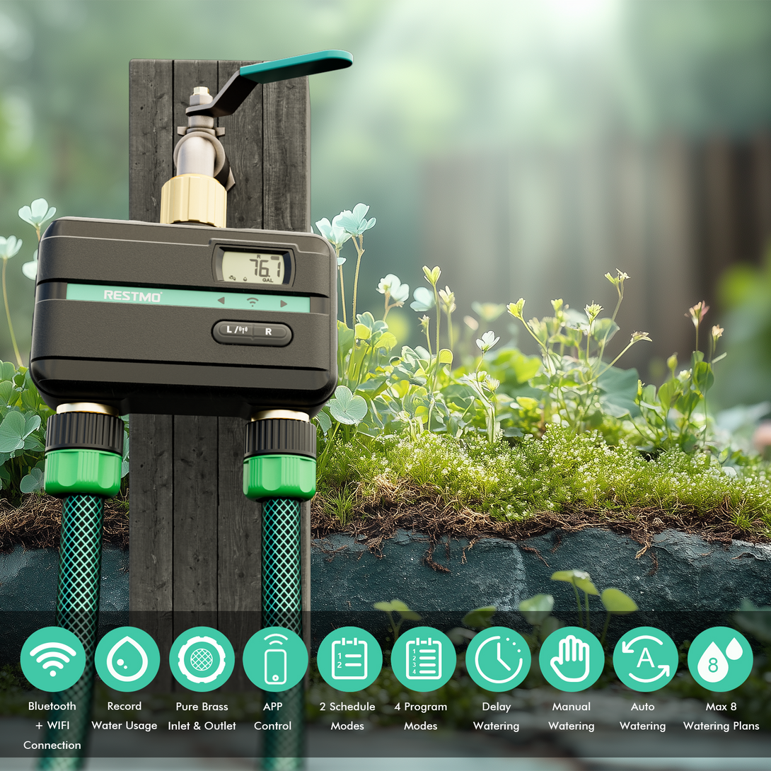 RESTMO Smart Sprinkler Timer with Flow Meter, 2 Zone Water Timer for Garden Hose, Brass Inlet & Outlet, Automatic Lawn & Yard Irrigation Watering System, APP Remote Control (2.4Ghz Wi-Fi Connection)