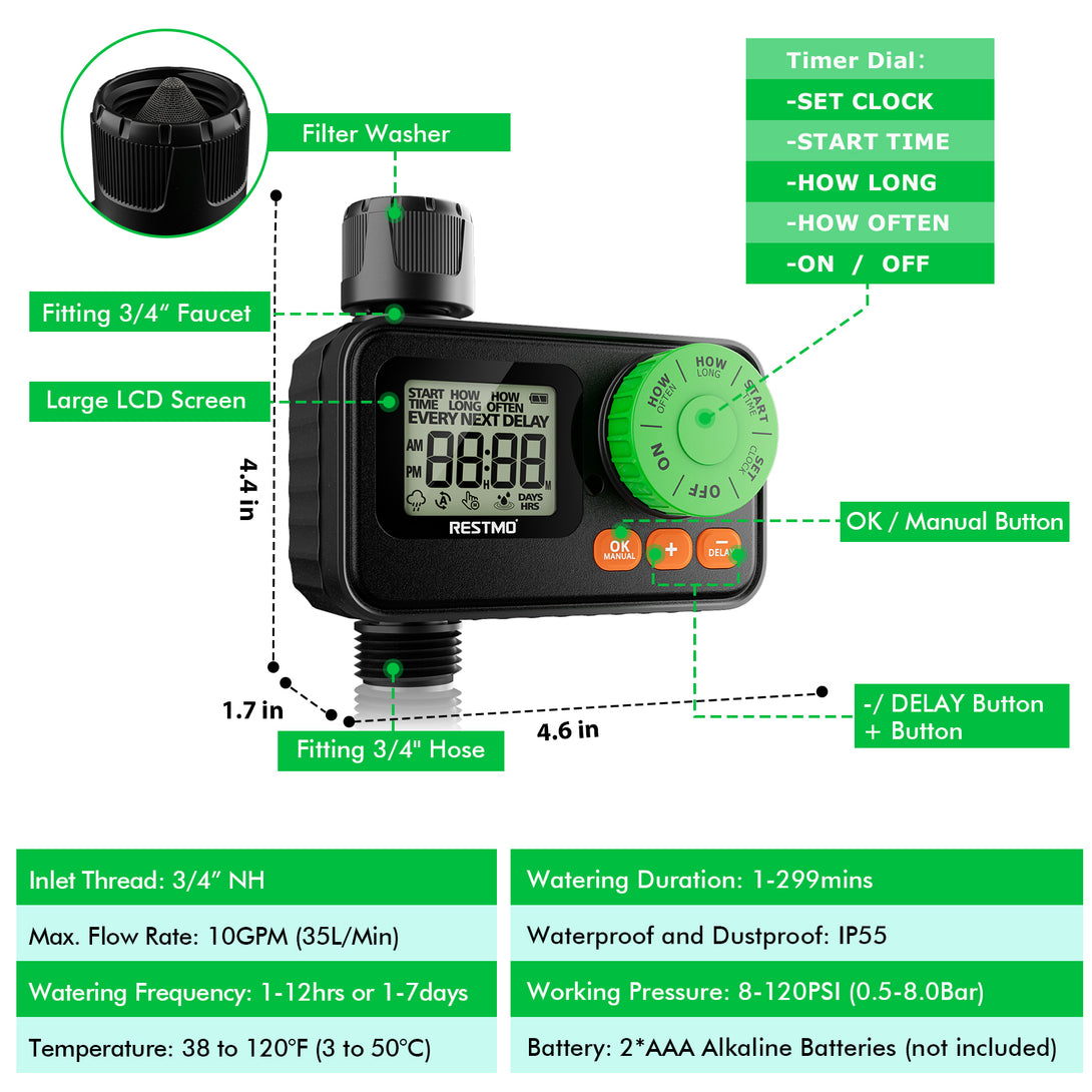RESTMO Sprinkler Timer, Programmable Water Timer for Garden Hose, Automatic Digital Control | Manual ON/Off | Rain Delay for Outdoor Faucet, Drip Irrigation and Lawn Watering System