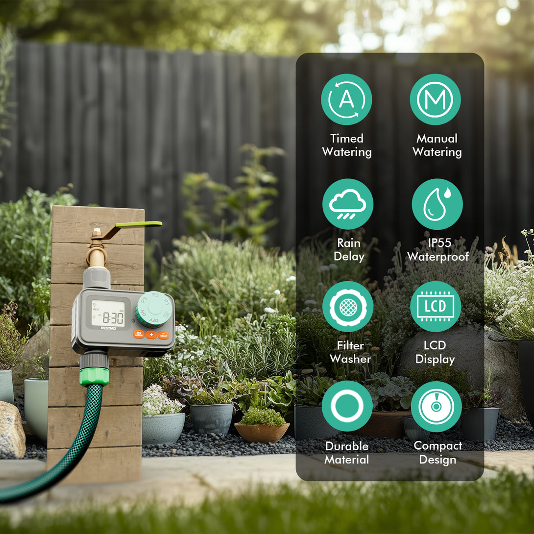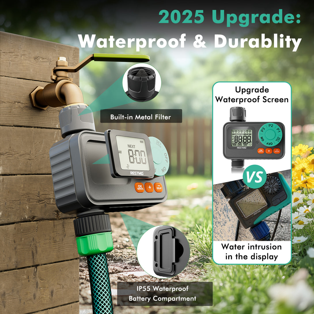 RESTMO Sprinkler Timer with 3 Separate Programs, 7-Day Programmable Water Timer for Garden Hose, Automatic Digital Control/Manual/Rain Delay for Drip Irrigation, Lawn and Yard Watering System