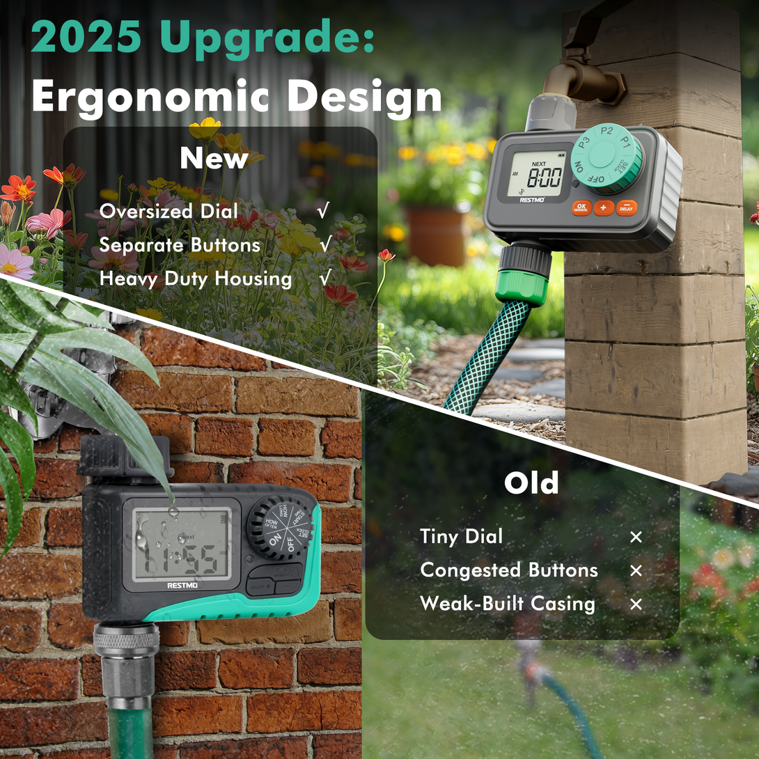 - 【Upgrade Waterproof & Durablity】Engineered for absolute leak-proof confidence, our timer’s seamless embedded screen eradicates water ingress, while the rugged textured panel withstands harsh wear. oversized dial and button for easy programming.