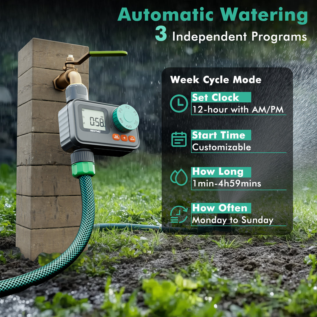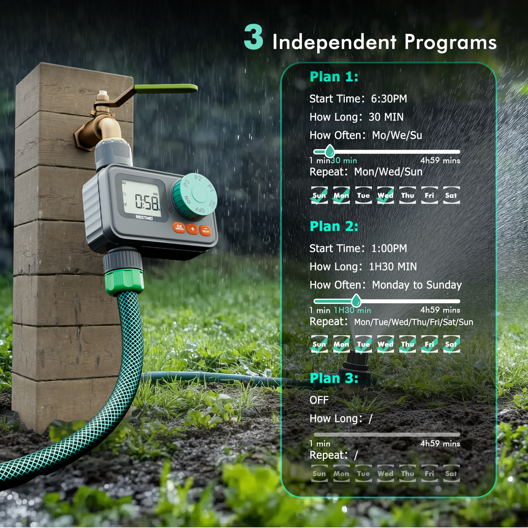 - 【3 Independent Programs】This sprinkler timer features 3 fully independent watering schedules, allowing you to customize start times, watering durations (1min - 4hrs 59mins) , and watering frequencies (any water days from monday to sunday) separately for different zones or tasks — perfect for handling diverse garden watering needs.