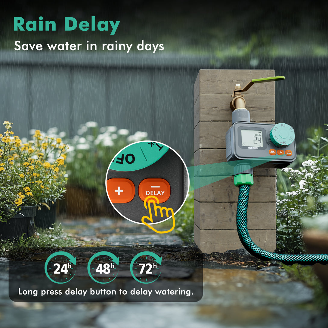 - 【Rain Delay & Manual Watering Mode】 With manual mode, you can water your flowers and plants from 1min to 299mins. With rain delay mode, you can choose from 24/48/72hrs and meets your flexible watering schedule.