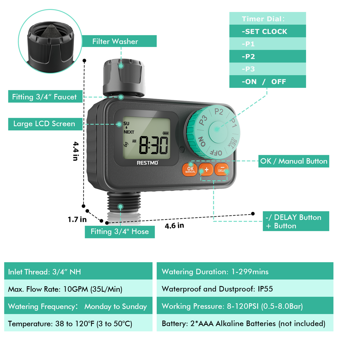 - 【Built for Outdoor Use】Designed with IP55 waterproof protection and leakproof construction. Single outlet with solenoid valve, fitting for 3/4” hose and faucet. Work with 8-120 psi water pressure. This timer is perfect for various outdoor watering applications, including garden hose irrigation, lawn sprinklers, greenhouse misting, pool filling, birdbaths, rain barrels, and even pet water dispensers.