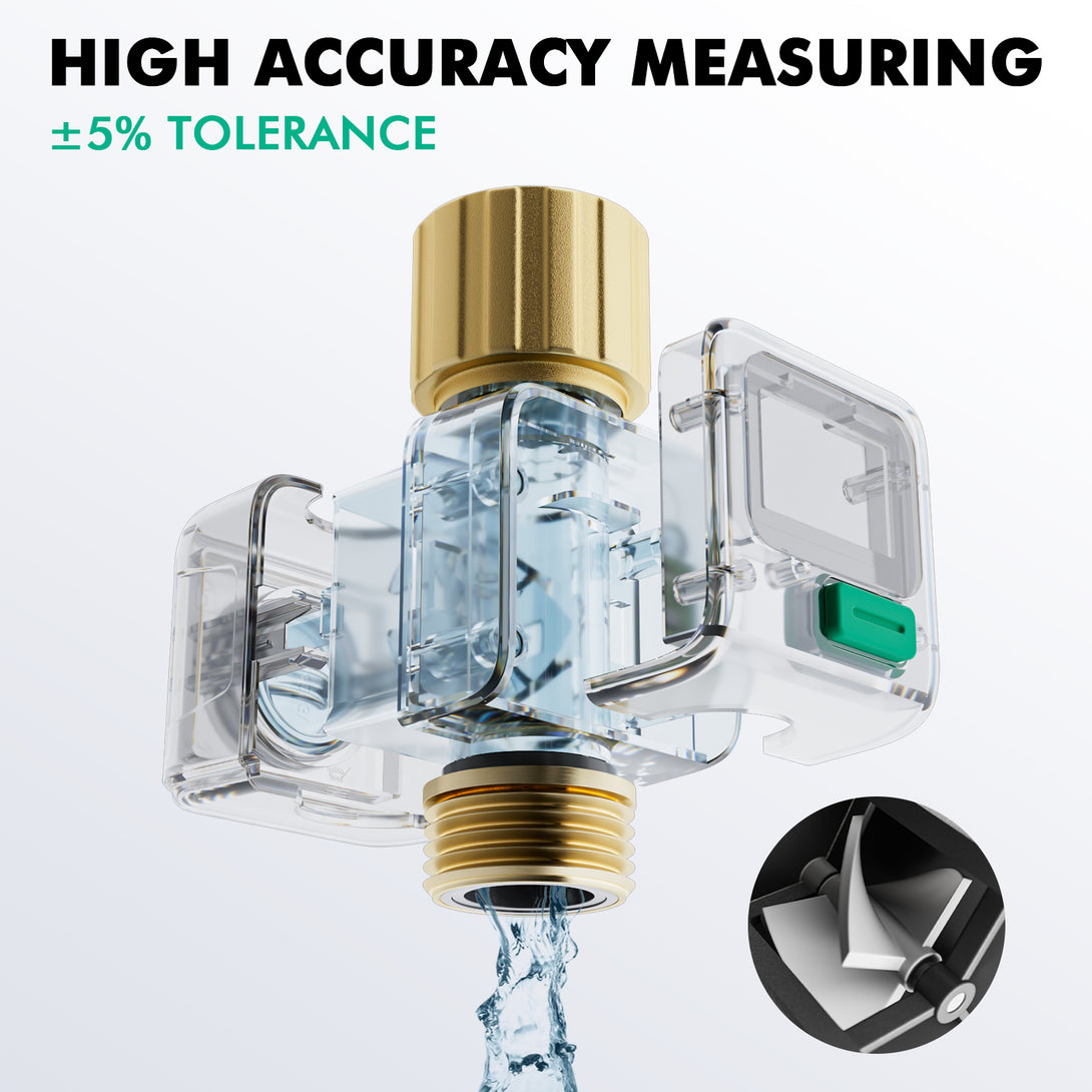 - Built-in with hall type sensor and IC chipset, which provide more accurate measurement and precise calculations. The measurement tolerance is less than 5%, great to measure how much amount of water are used and prevent over-watering.