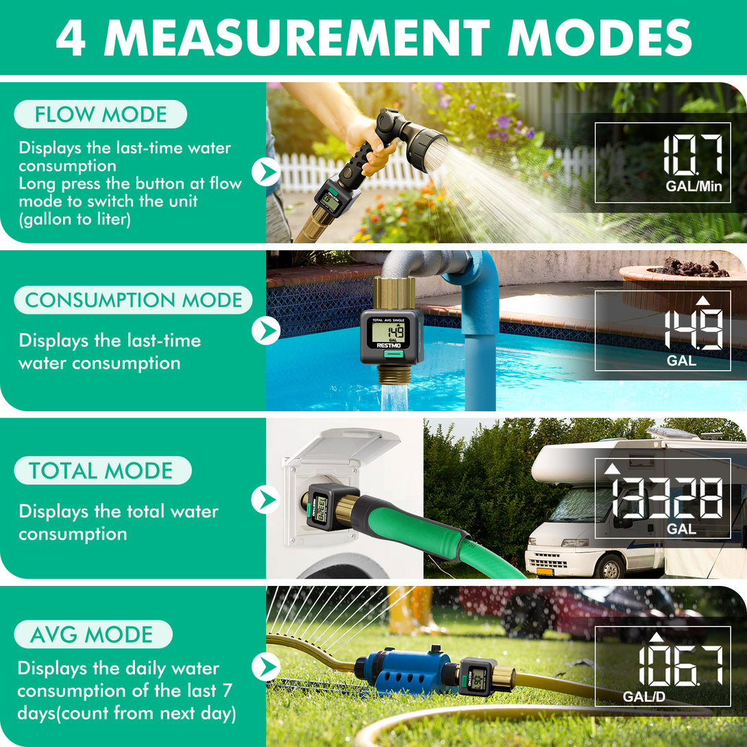 - Equipped with an easy-to-read LCD screen and one-touch control push button, this water flow meter can easily display and track the water usage & flow rate of your outdoor garden hose with 4 different measurement modes.