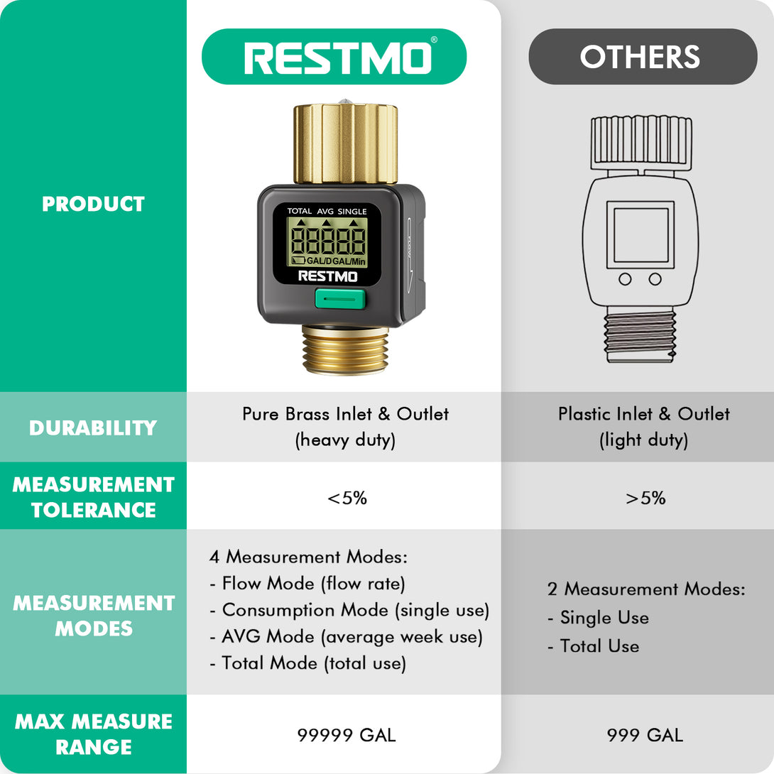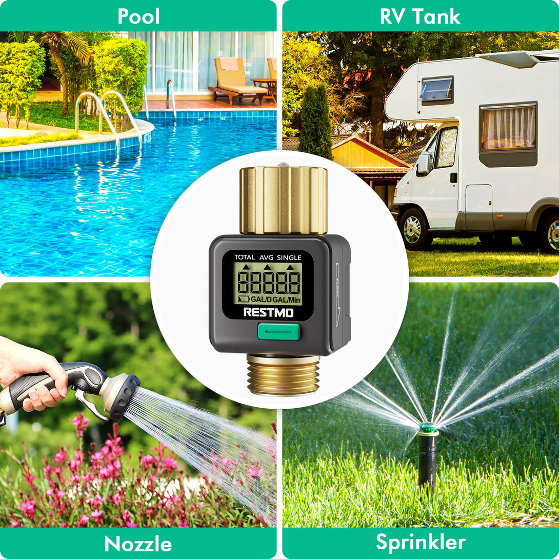 RESTMO Water Flow Meter with Brass Inlet & Outlet, Measure Gallon/Liter Consumption and Flow Rate for Outdoor Garden Hose Watering, RV Water Tank Filling, Lawn Sprinkler and Nozzle Sprayer